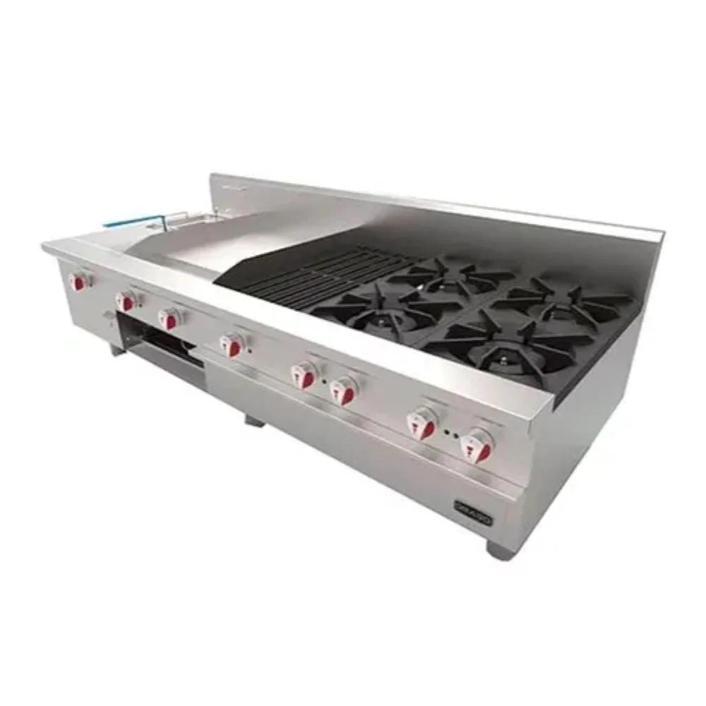 Estufa con 4 quemadores, asador de 1 pie, plancha de 2 pies, freidora y grati- nador